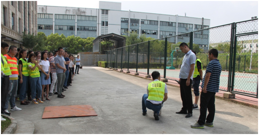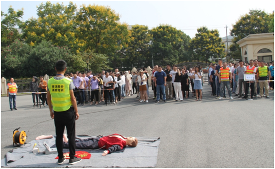 撤離到集合點后,分成各列隊,在南消公司專業人員的指導下各人員一一進行了心肺復蘇學習與實際操作。心肺復蘇有三個步驟:①確保受傷者盡可能平躺,用力按壓下巴;②將一只手的后掌放在胸骨上,將第二只手的手指在第一只手之間互鎖,進行30次胸部按壓;③傾斜傷者的頭,抬起下巴,捏住鼻孔進行1到2次口對口呼吸。