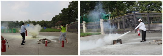 另外一邊的滅火器演習區氣氛也是非常的認真熱烈。此次滅火器是采用的干粉滅火器,它適用于撲救各種易燃、可燃液體和易燃、可燃氣體火災,以及電器設備火災。“紙上得來終覺淺”,在南消的專業指導后,大家也紛紛投入了滅火器的使用嘗試中。首先,用右手提著滅火器到現場,除掉鉛封并拔掉保險銷,左手握著噴管,右手提著壓把。在距離火焰兩米的地方,右手用力壓下壓把,左手拿著噴管左右擺動,噴射干粉覆蓋整個燃燒區。大家一個個排隊使用,雖然天氣炎熱,但始終對消防學習保持著高度的熱忱。